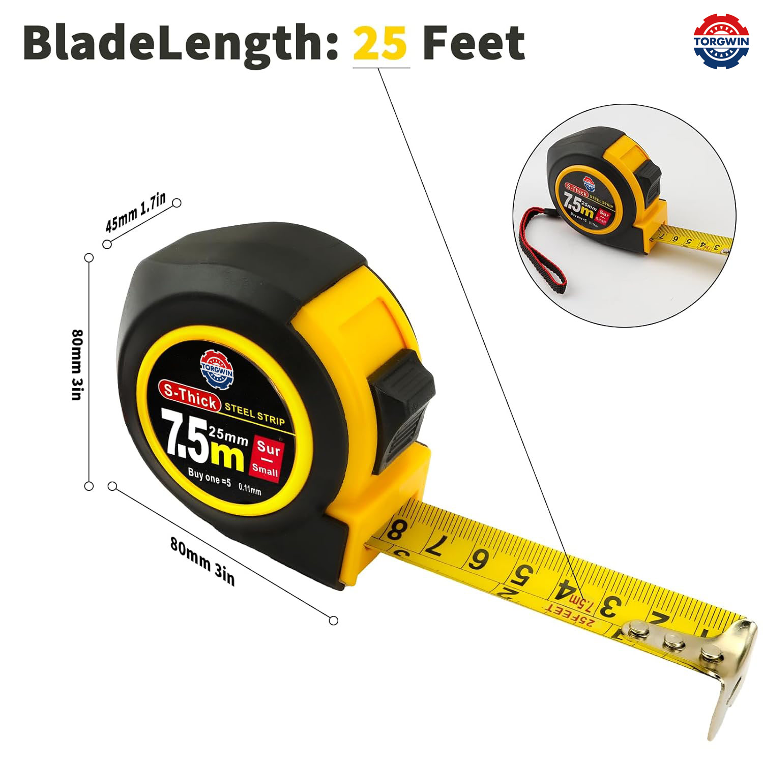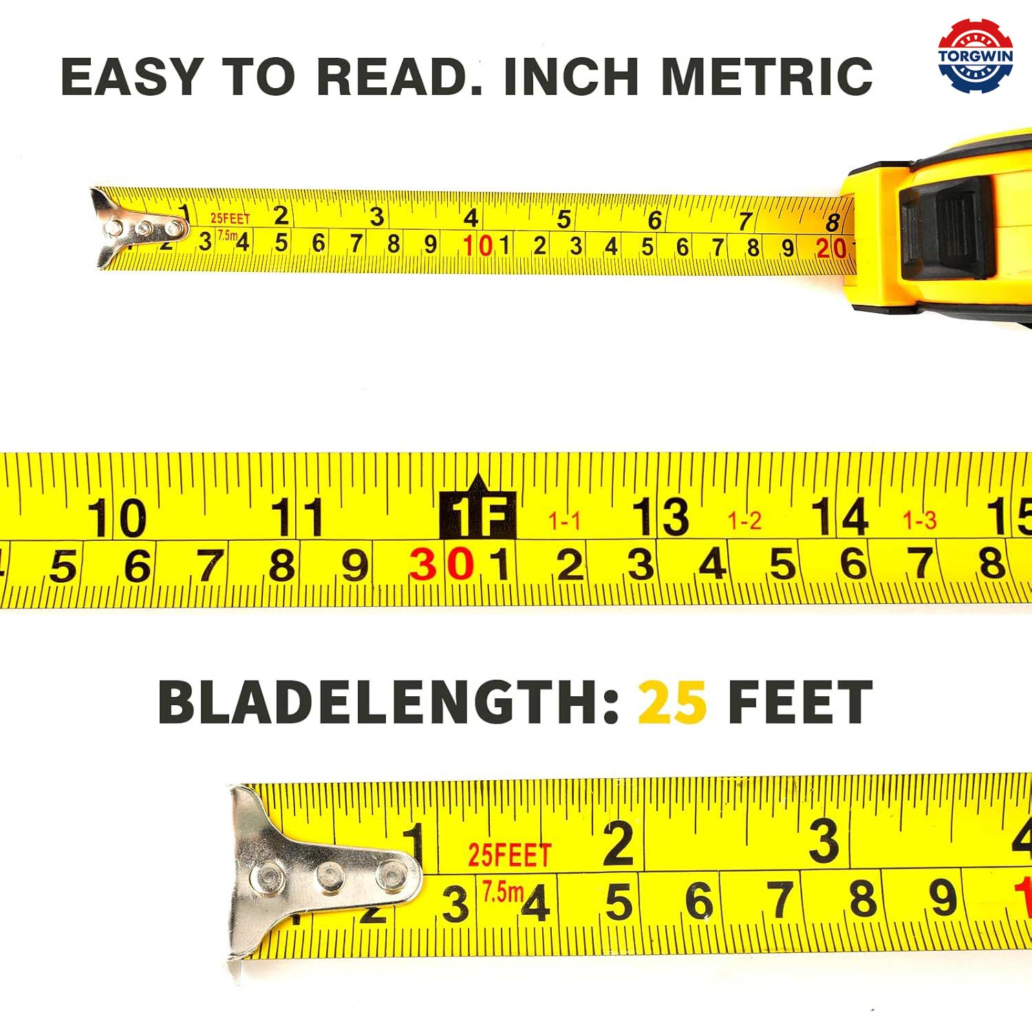 인치와 메트릭 단위로 명확하고 눈에 띄는 표시가 특징 인 테이프 척도는 빠르고 정확한 판독 값을 보장합니다.